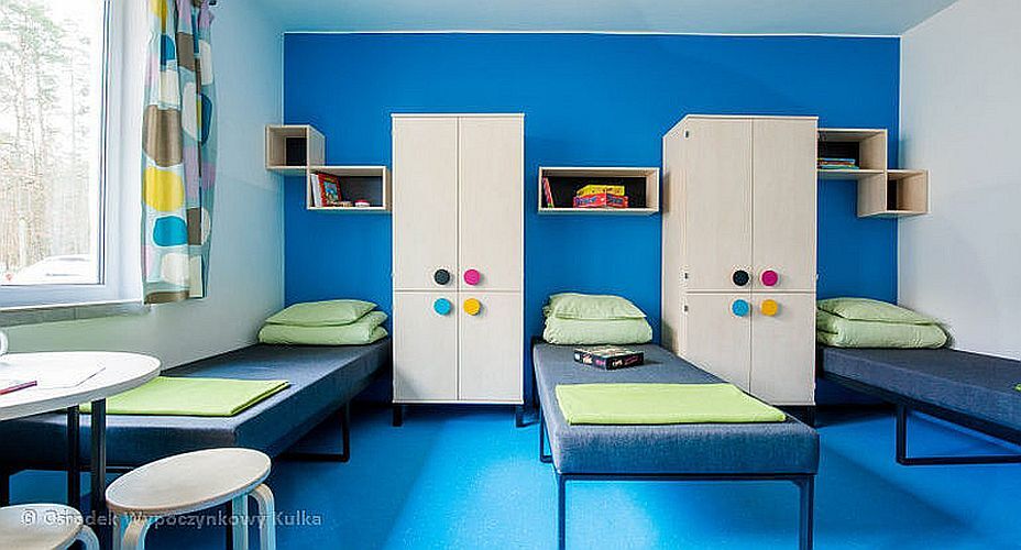 Pokoje wyposażone są w tapczany lub w tapczany i piętrowe łóżko, półki, szafy, stół i krzesła.